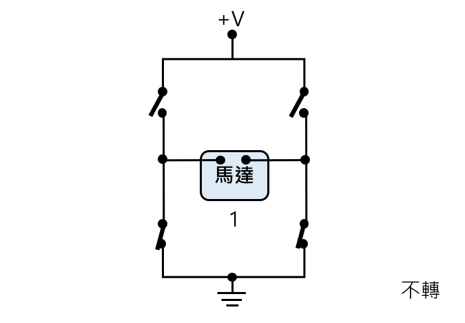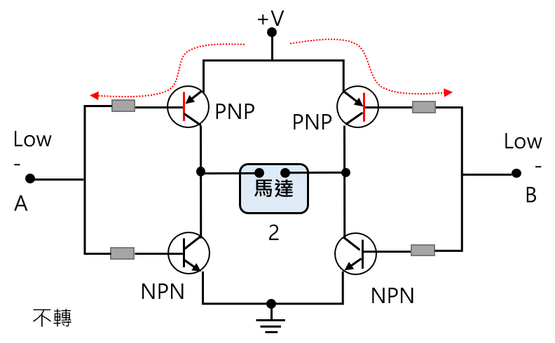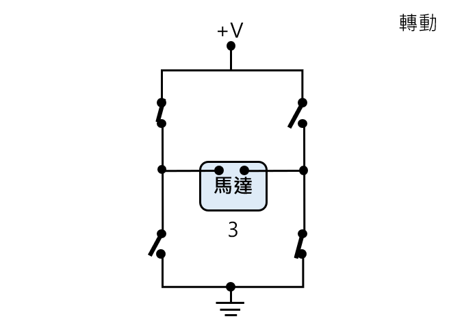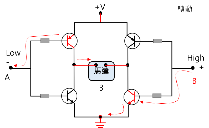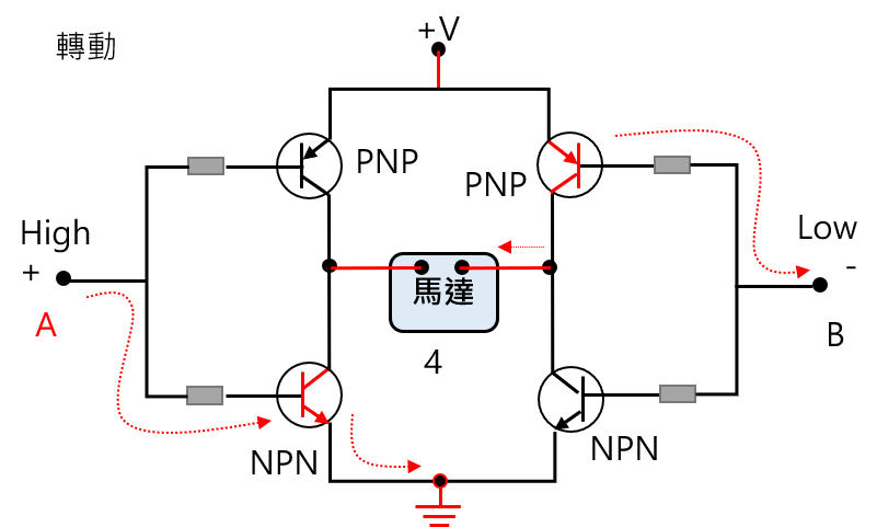 用四個電晶體取代四個開關,PNP電晶體是Low電位啟動,NPN電晶體是High電位啟動。本課程會介紹H型馬達驅動電路做實驗,實驗四個開關中,哪幾個開關開啟後,馬達就會轉動,而它們的轉動方式有什麼不同。再用PNP電晶體及NPN電晶體取代開關後,它的啟動方式。