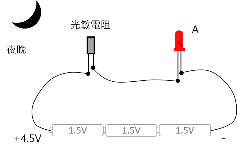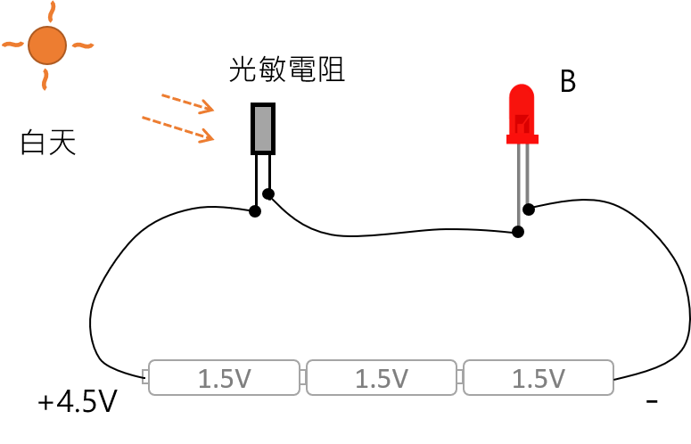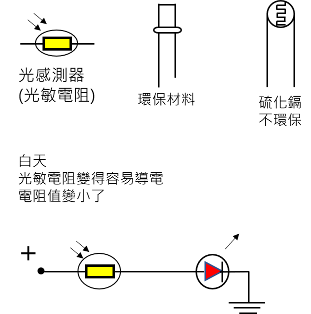 光感測器 光敏電阻 下列A和B,哪一個LED比較亮? 光感測器的用途: 晚上自動會亮的路燈 黑暗中自動亮的小夜燈 黑暗中自動閃光的相機 這裡用的光敏電阻是環保材料,很像發光二極體,長短腳方向要注意,長腳接正電方向。 光敏電阻在光線照射下會變得很容易導電,也就是電阻值變小了,電流就變大了,LED就比較亮。 我們所用的光敏電阻在陽光下,電阻值大約是幾百歐姆,在室內燈光下,電阻值大約在幾千歐姆至幾萬歐姆之間。