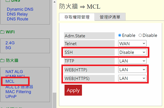 進入防火牆的 MCL 選項,把 WEB(HTTP)及WEB(HTTPS)都更改成 LAN 。