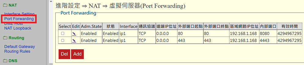 虛擬伺服器在這台裝置稱為 Port Forwarding,由NAT 選取 Port Forwarding 選項,設定 port 及 ip。