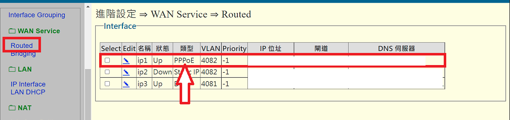 底下的 interface 選 ip1,這裡的interface要選哪一個,我是從Routed中找到哪一個是PPPoE的,然後再設定 port 及 ip