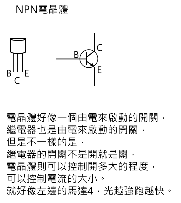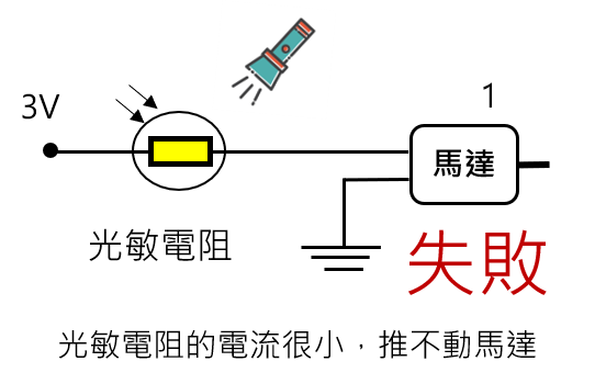 1. 光敏電阻的電流很微小,雖然可以點亮發光二極體,卻沒辦法讓馬達轉動。所以怎麼辦呢?
