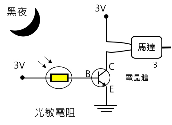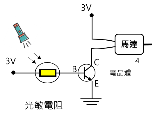 3. 下面的電路圖,光線照射光敏電阻,激發出微小電流,這微小電流再激發電晶體,電晶體的C和E之間的電路導通了,於是馬達就運轉了。