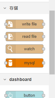 要先到右上角部署旁的功能鍵下的設置地方。我們可以看到使用者設置這邊,到Palette的安裝搜尋處,填入關鍵字”node-red-node-mysql”,按下安裝按鍵。安裝完成後,我們可以在儲存的地方看到mysql元件。