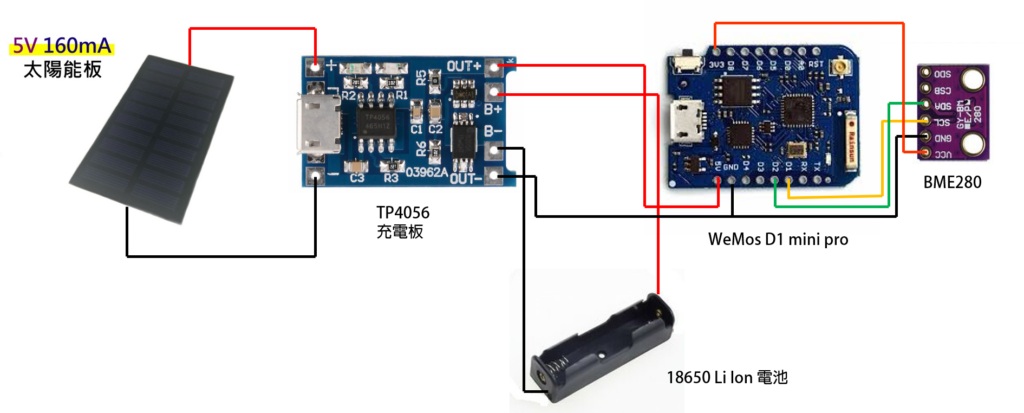 參考上述電路圖,將引腳母接頭、電路線焊接在纖維板上,再將WeMos、TP4056、BME280、太陽能板及電池盒安裝上。