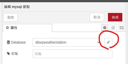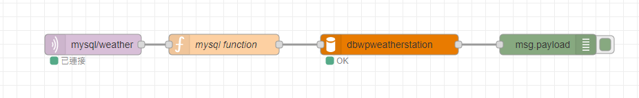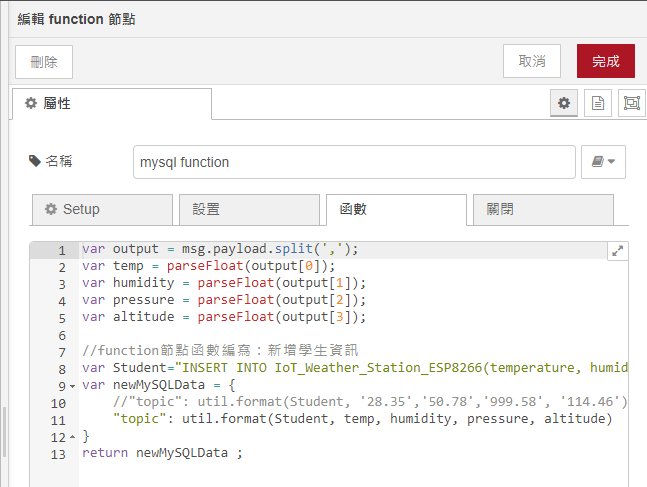 mysql function 節點功能是收到mqtt的主題的訊息,該訊息包含溫度、溼度、氣壓及海拔四個值,所以這裡就是將它折分為四個參數值,並填入INSERT INTO語法中,再傳給mysql節點。