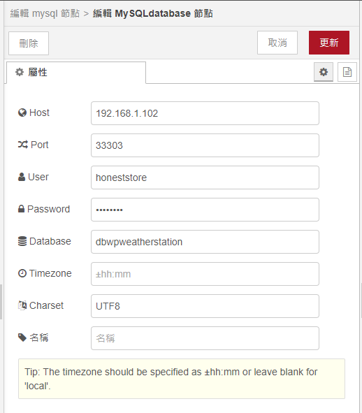 msyql節點就是設定它跟雲端的mysql資料庫主機連線,讓從function傳過來的INSERT INOT語法可以寫入參數值。