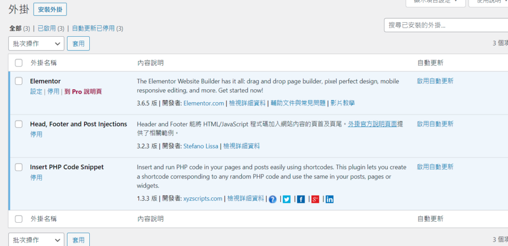 我這裡有安裝三個外掛,Elementor、Insert PHP Code Snippet及Head,Footer and Post Injections這三個外掛。