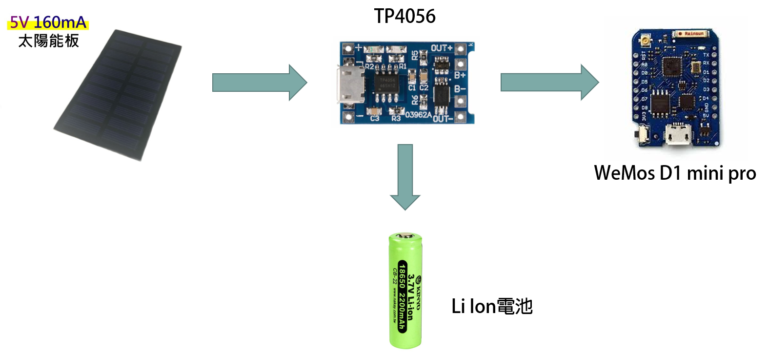 本計劃是使用在戶外或偏遠地方,要持續運作氣象站,必須有連續的電源,否則系統將無法工作。可以向電路提供連續電源的最佳方法是使用電池,只是一般電池放電幾天之後,電池電量將耗盡。因此,該範例提出了一種太陽能充電電路,讓使用者利用從太陽中得到電能,為電池充電並為Wemos板供電。本案例是使用18650電池。