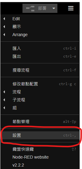 因為要有新增到MySQL雲端資料庫的功能及Line Notify的功能,所以我們先到右上角部署旁的功能鍵下的設置地方。我們可以看到使用者設置這邊,到Palette的安裝搜尋處,填入關鍵字”node-red-node-mysql”,按下安裝按鍵。安裝完成後,我們可以在儲存的地方看到mysql元件。接著填入”node-red-contrib-line-notify”,按下安裝。安裝完成後,我們可以在Line的地方看到line-notify元件。