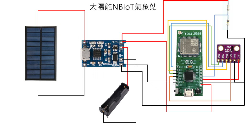 參考上述電路圖,將引腳母接頭、電路線焊接在纖維板上,再將DSI2598、TP4056、BME280、太陽能板及電池盒安裝上。
