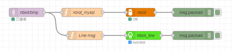 NBIoT版本的我會加上電池自我檢測的功能。另外Line的通知功能,我們要移到Node-RED上,也就是NBIoT將抓取到的環境溫度、溼度、氣壓及海拔數據,透過MQTT上傳到Node-RED的MQTT主題,再由mysql工具及line-notify工具,分別執行寫入雲端資料庫及line通知聊天室的功能。