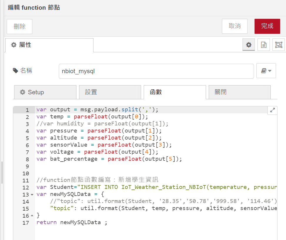 mysql function 節點功能是收到mqtt的主題的訊息,該訊息包含溫度、溼度、氣壓及海拔四個值,所以這裡就是將它折分為四個參數值,並填入INSERT INOT語法中,再傳給mysql節點。