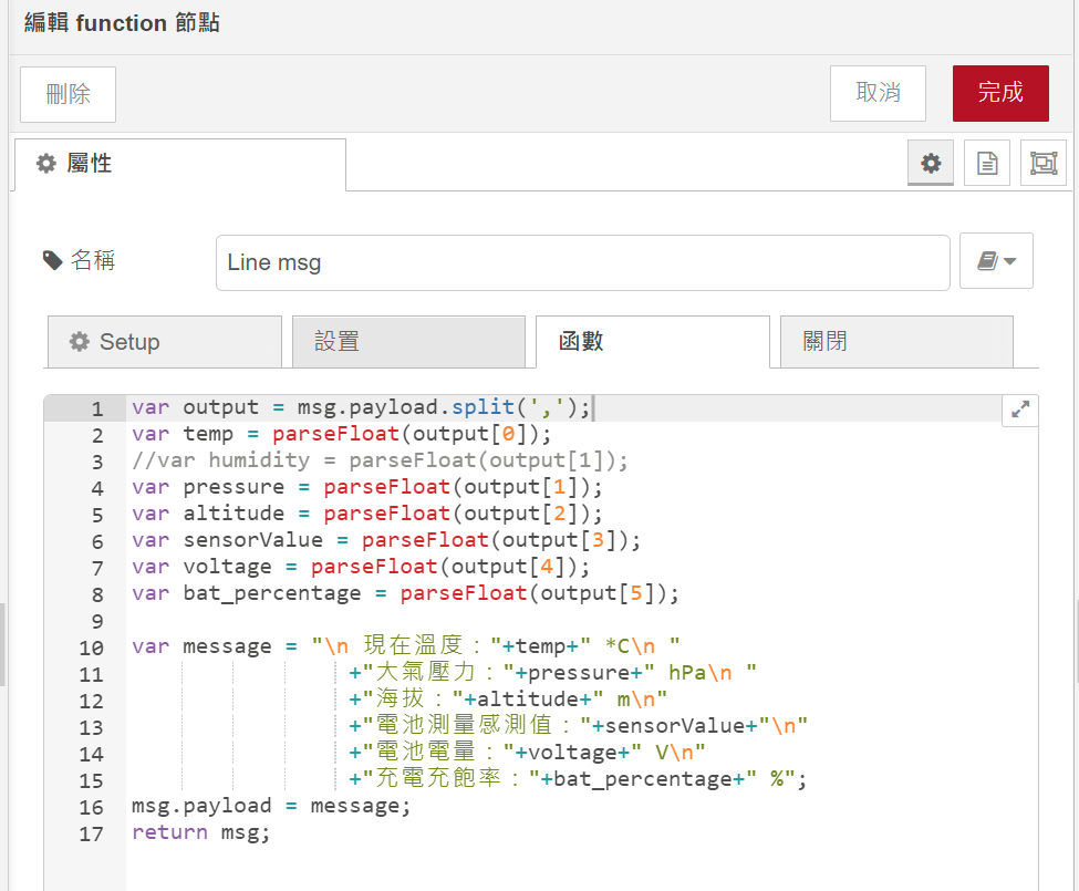 Line Msg function節點功能是收到mqtt的主題的訊息,該訊息包含溫度、氣壓、海拔、電池電量偵測值、電壓及電量百分比等七個值,所以這裡就是將它折分為七個參數值,並填入INSERT INOT語法中,再傳給Line Notify節點。