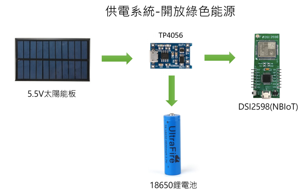 本系統是使用在戶外或偏遠地方,要持續運作氣象站,必須有連續的電源,否則系統將無法工作。可以向電路提供連續電源的最佳方法是使用電池,只是一般電池放電幾天之後,電池電量將耗盡。因此,本範例提出了一種太陽能充電電路,讓使用者利用從太陽中得到電能,為電池充電並為DSI2598板供電。本案例是使用18650電池。